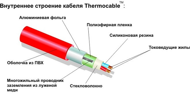 ― Изолированные токоведущие жилы помещены в сплошную оболочку из алюминиевой фольги, которая обеспечивает герметичность, дополнительную прочность, снижает уровень электромагнитного излучения, равномерно распределяет тепловую энергию по всей длине нагревательного кабеля.